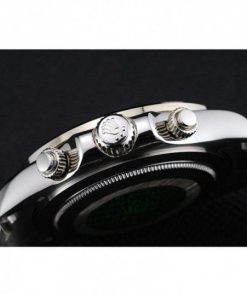 | CROWN | Rolex logo engraved polished stainless Acciaio cutwork crown with a cutwork push-button crown on either side of it |