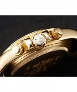 | CROWN | 18k yellow gold cutwork crown with Rolex logo and two smaller cutwork push button crowns on either side of it |